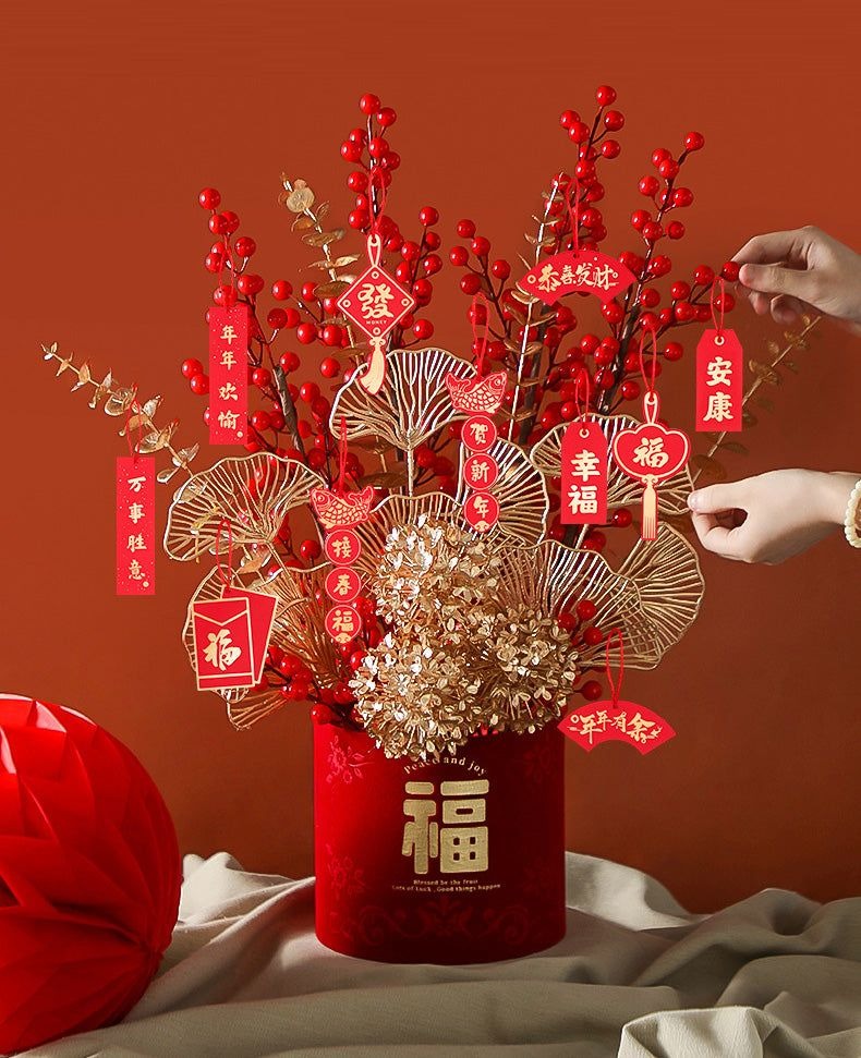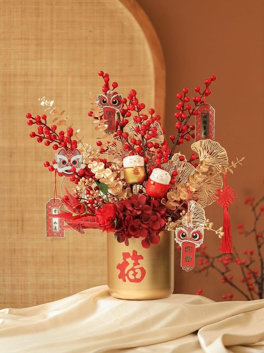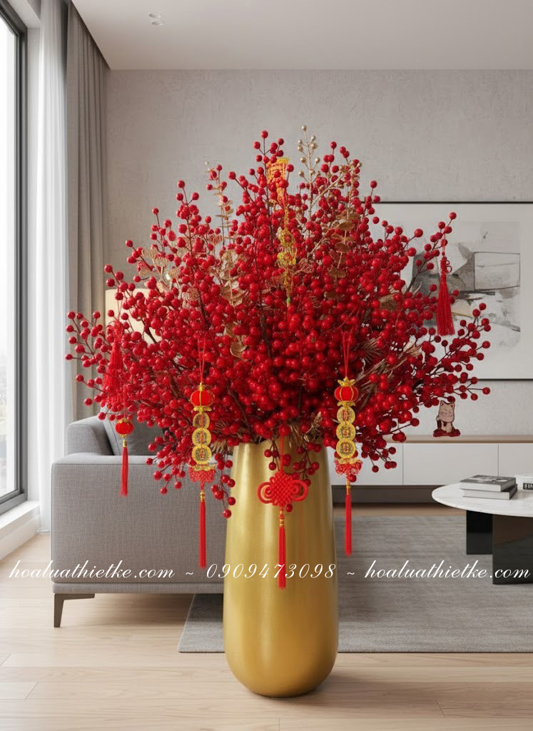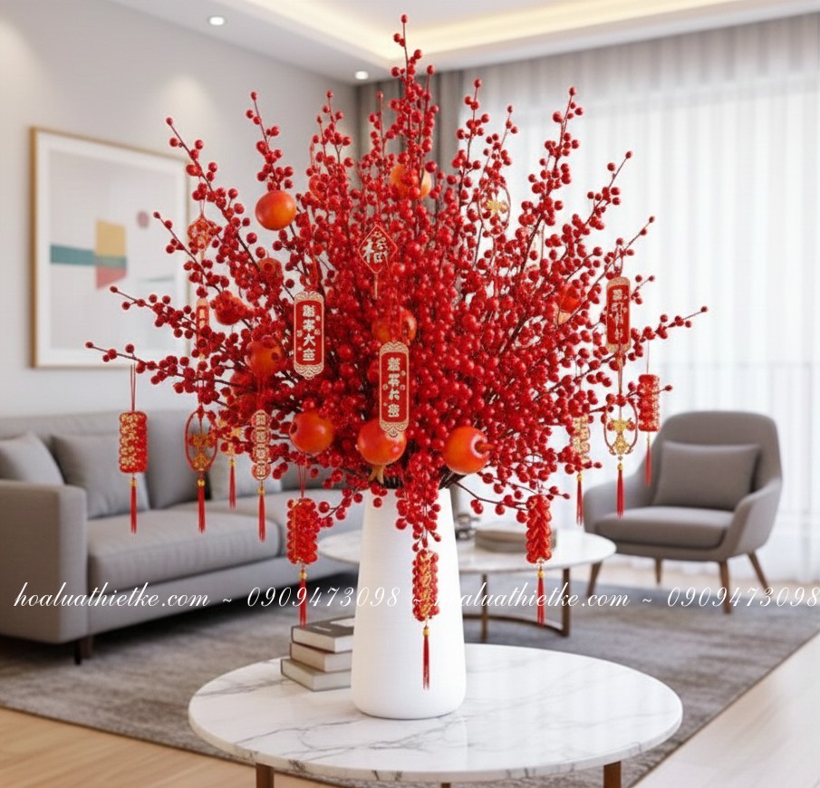 Bạn có thể treo bao lì xì, dây đồng xu, nơ đỏ, dây tua rua hoặc các câu đối lên cành để tạo sự sum suê và tạo điểm nhấn cho bình hoa. Ngoài ra có thể kết hợp các phụ kiện khác như cành lộc, lá bạc, lá kim tuyến để tăng sự sang trọng.