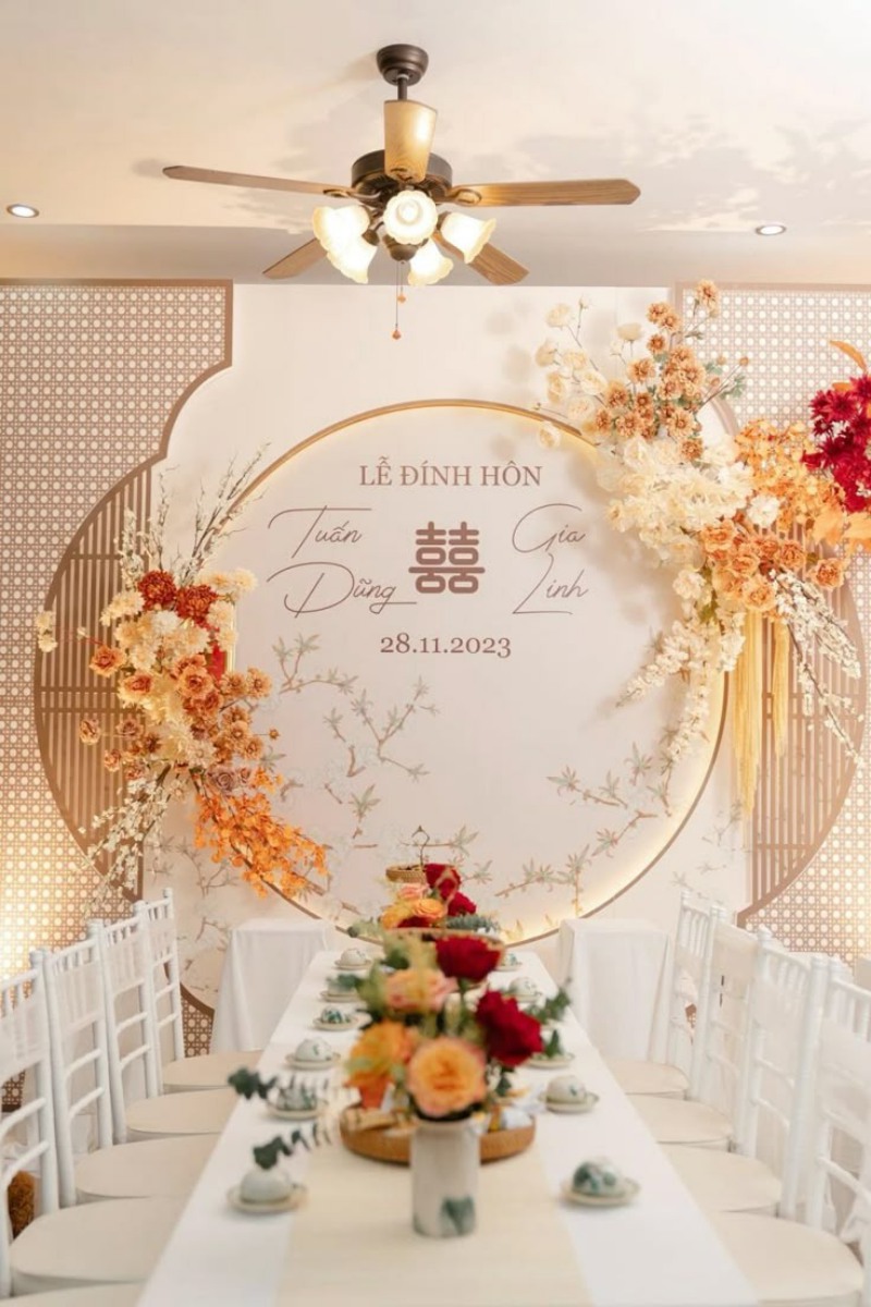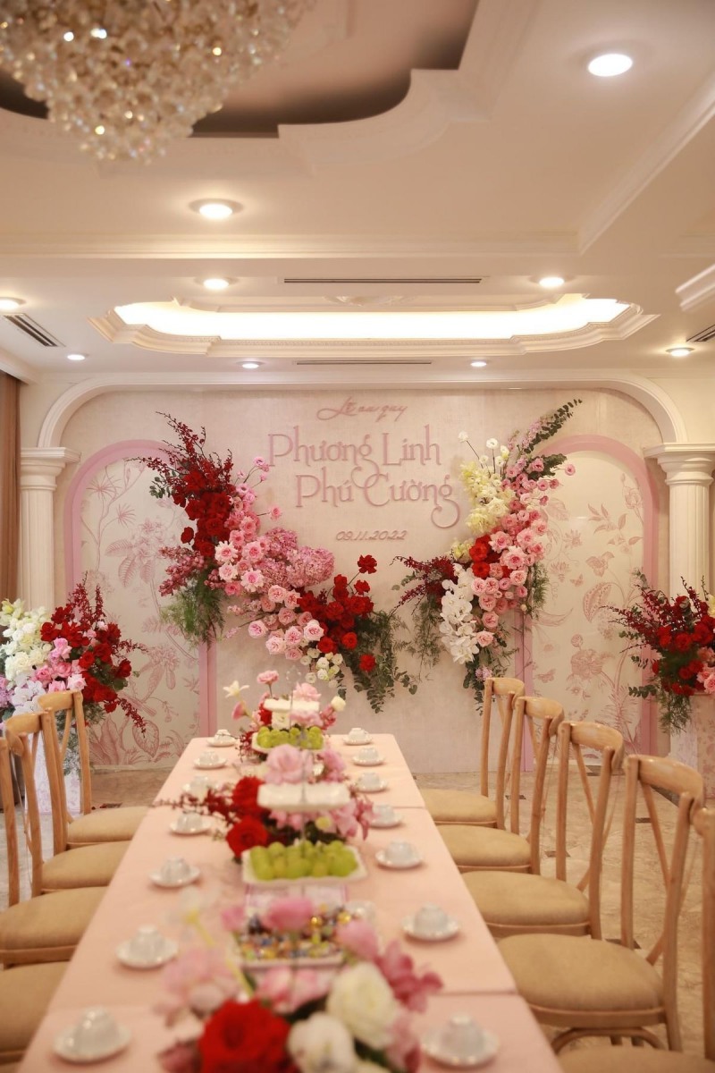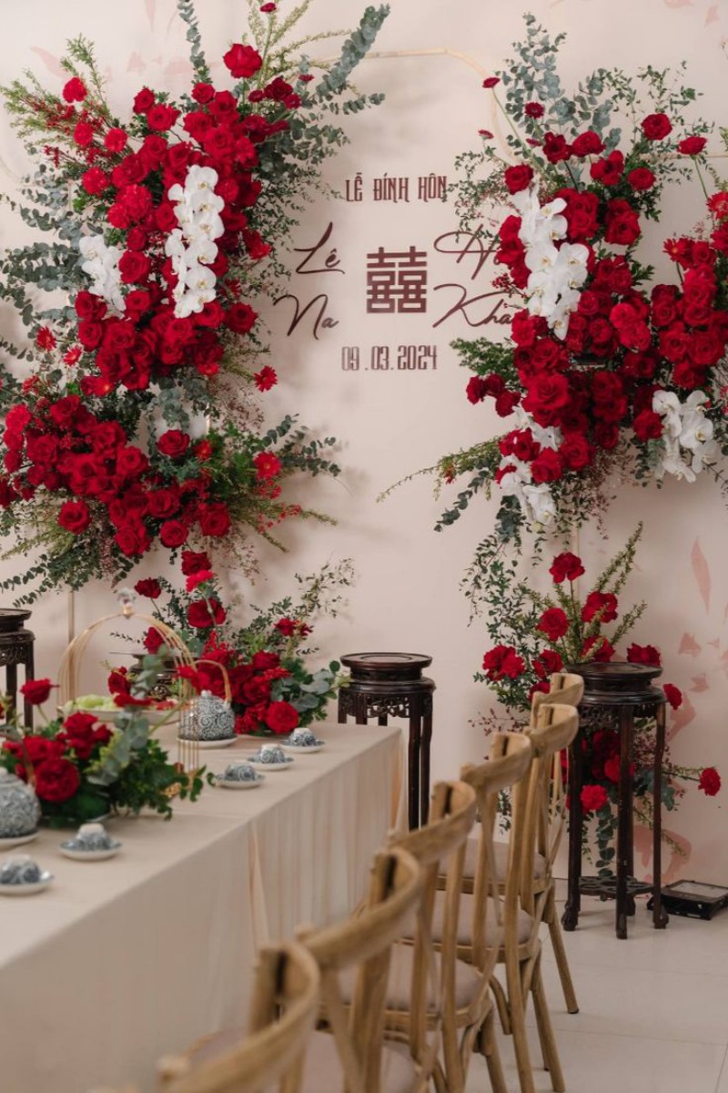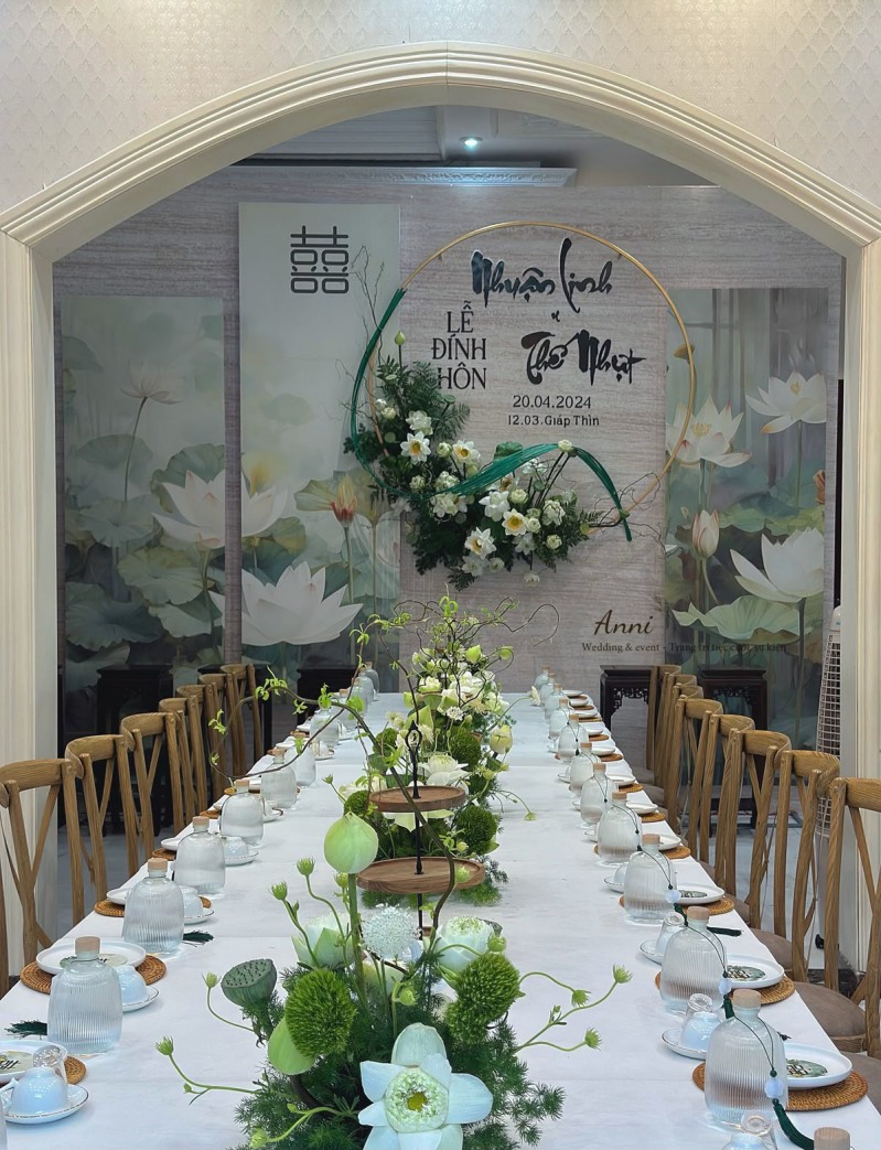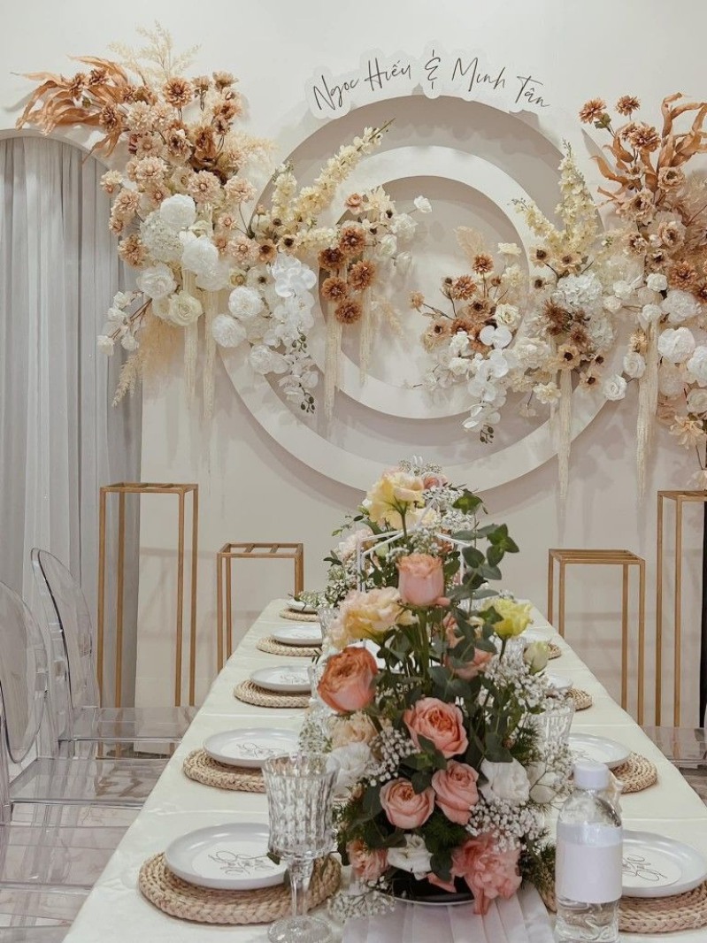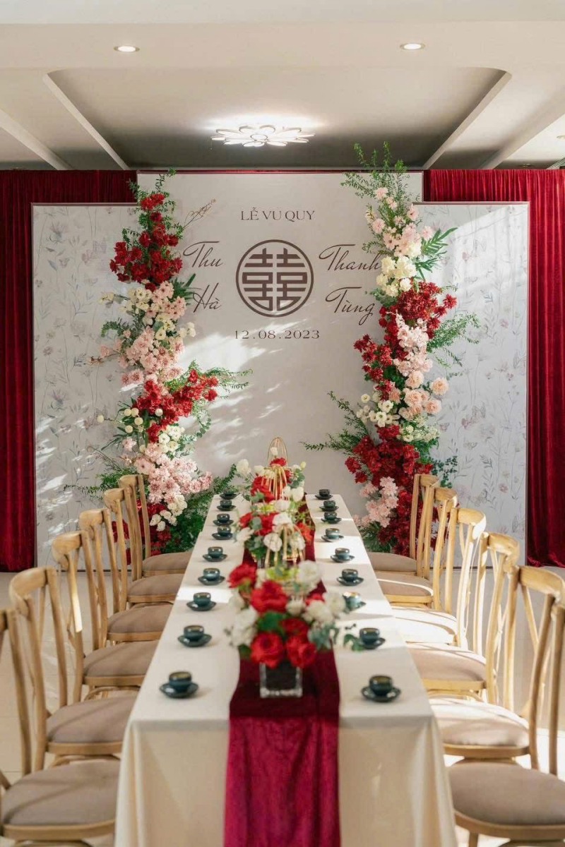 - Trang trí bàn gallery và lối đi: Hoa lụa được bày trí tinh tế trên bàn gallery và dọc lối đi, tạo nên không gian ấm áp và trang nhã cho buổi tiệc.