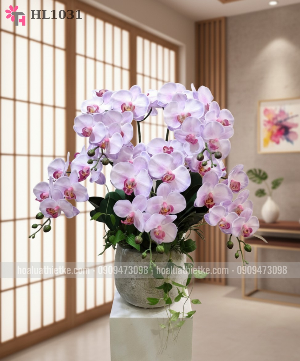 Chậu lan hồ điệp giả hồng tím nhạt HL1031 sử dụng chậu đá xi măng hoa văn đơn giản, giúp tổng thể thêm phần sang trọng, hiện đại và chắc chắn. Đặc biệt, Hoa Lụa Thiết Kế hỗ trợ thay đổi kiểu chậu theo sở thích khách hàng, đảm bảo phù hợp với phong cách từng không gian.